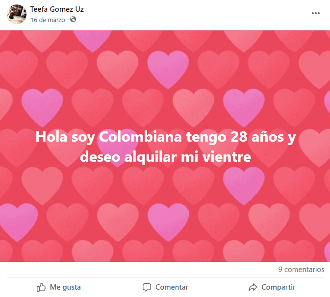 En Facebook, por ejemplo, se encuentran diferentes comunidades en las que mujeres de diferentes partes del país ofrecen alquilar sus vientres para quienes que por distintas razones no pueden ser padres de forma natural.
