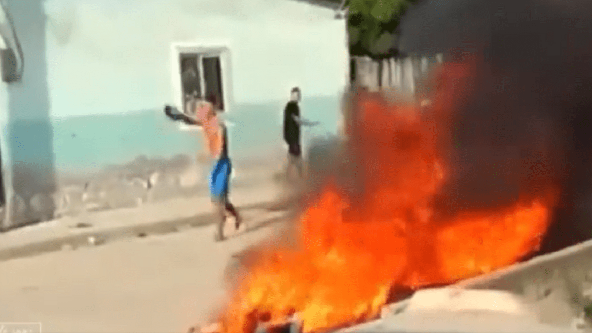 En videos que circulan por redes sociales se observa a un individuo de torso desnudo arrojando con un recipiente algún tipo de líquido sobre los dos cuerpos tendidos en una calzada. Luego se enciende una hoguera.