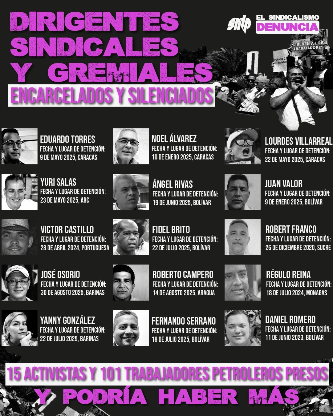 - Eduardo José Torres Muñoz (49 años), abogado y dirigente sindical vinculado a Provea y a la Asociación de Profesionales Universitarios en Funciones Administrativas y Técnicas (Afufat) de la UCV. Fue detenido el 9 de mayo de 2025 en Caracas de manera arbitraria tras salir de una reunión con otros dirigentes en Parque Central. Desde entonces permanece desaparecido y se desconocen los cargos en su contra.