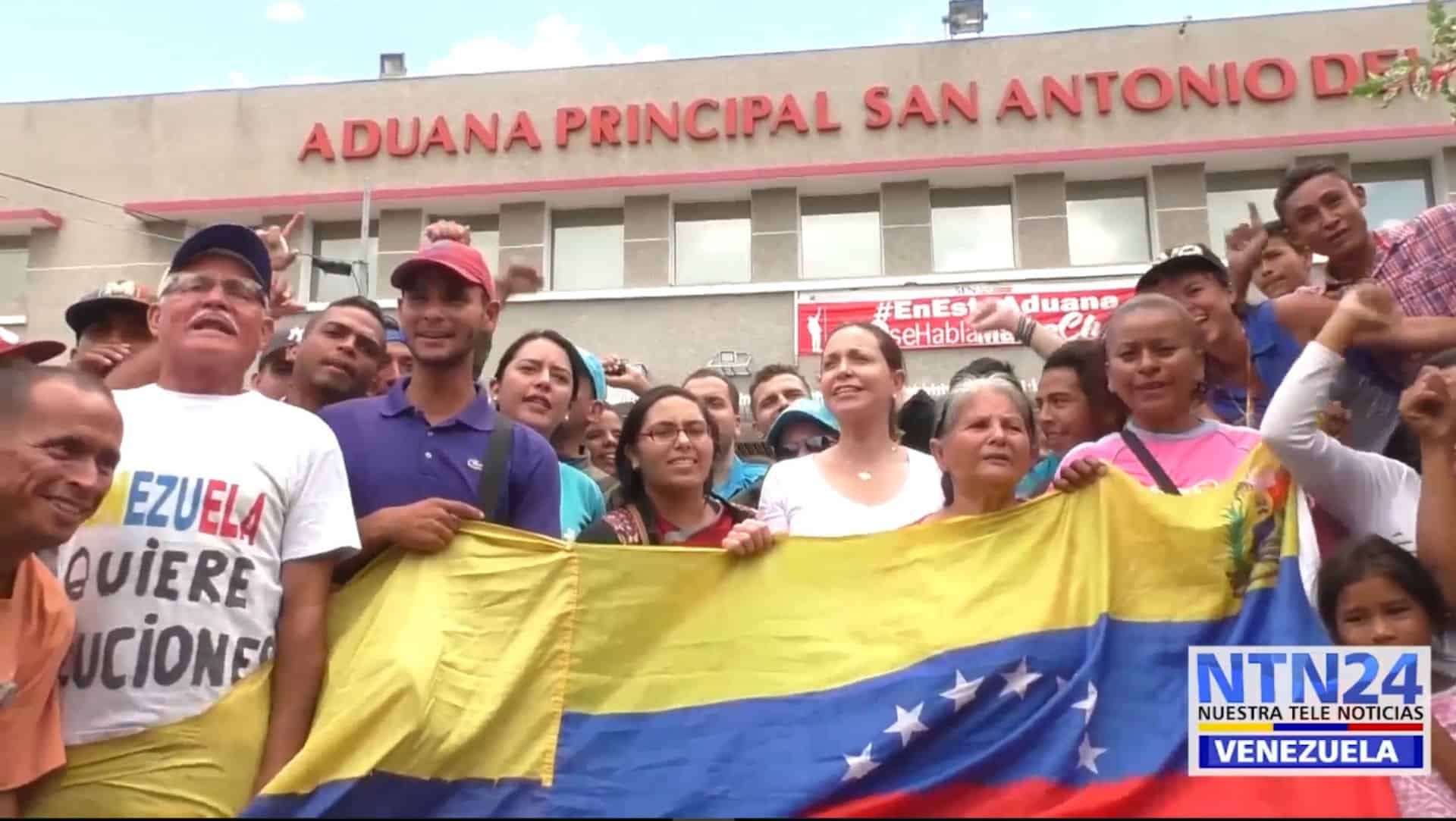 Machado llegó hasta la sede de la Aduana donde cuelga un letraron que dice "aquí no se habla mal de Chávez" , precisamente donde gritó mensajes sobre la debacle que enfrenta el país producto del "narcogobierno", como decidió llamarlo.