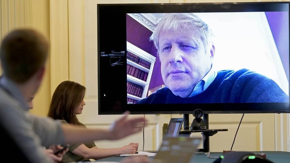 Johnson anunció el 27 de marzo que había dado positivo al covid-19 y permanecería siete días en aislamiento en su apartamento de Downing Street, a cuya puerta le dejaban comidas y papeles.