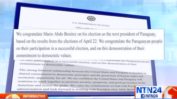 EE. UU., España, Argentina y Colombia saludan elección de Abdo Benítez como presidente de Paraguay