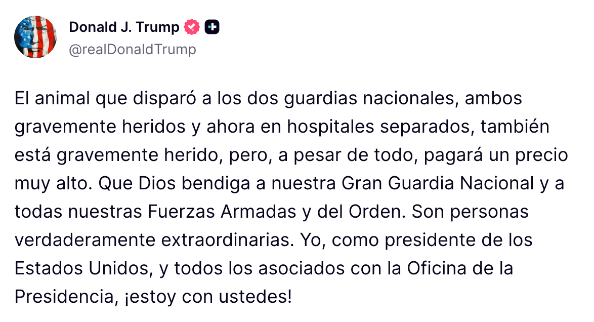 Tras esto, el presidente Donald Trump se pronunció en su cuenta de Truth Social y aseguró que el atacante "pagará un precio muy alto", además, envió un mensaje de apoyo a las Fuerzas Armadas, especialmente a la Guardia Nacional.