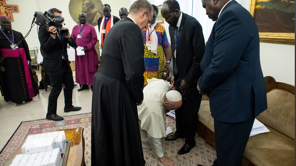 Después se arrodilló ante el presidente de la República de Sudán del Sur, Salva Kiir, y el jefe rebelde Riek Machar, exenemigos llamados a gobernar juntos.