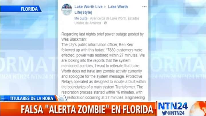 Los residentes de Lake Worth se quedaron sin servicio eléctrico por 30 minutos y recibieron un mensaje de las autoridades que atribuía el problema a una "actividad zombi".