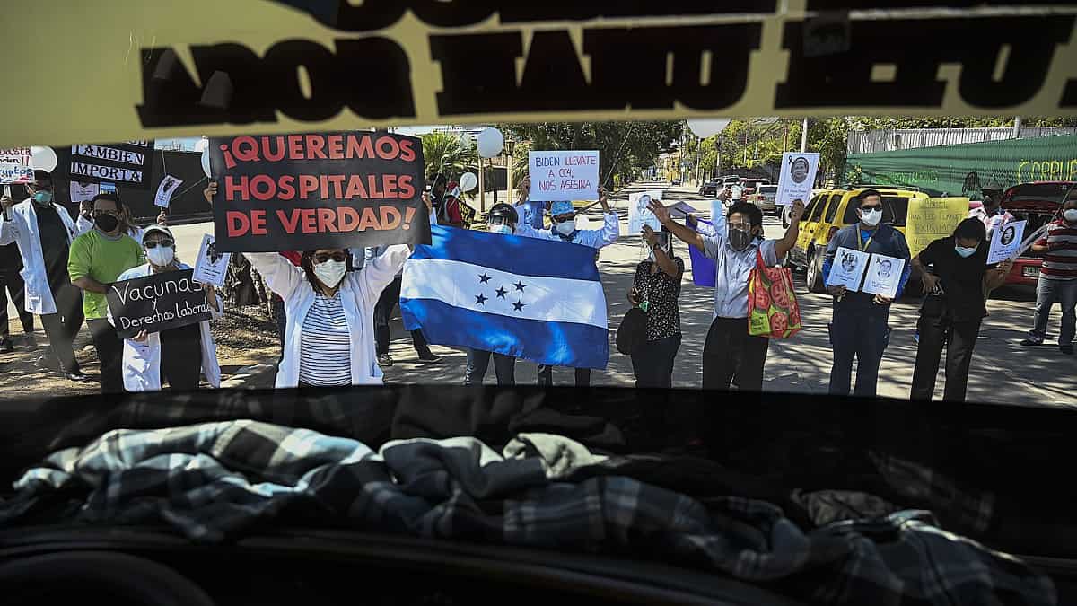 "Cese al genocidio contra el personal de salud", decía una de las pancartas de unos 300 miembros del Colegio Médico de Honduras (CMH), que se reunieron frente al hospital móvil instalado por el gobierno al este de la ciudad para atender a los enfermos de covid-19.