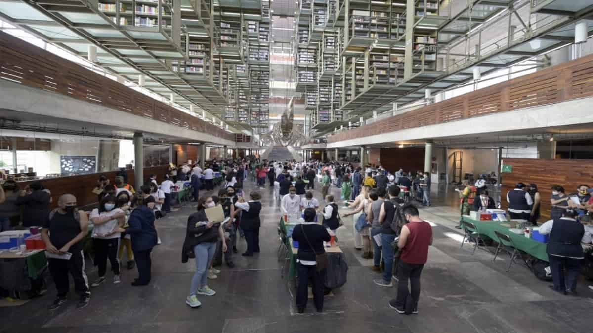 En la biblioteca Vasconcelos de la Ciudad de México los jóvenes hacían largas filas para ser vacunados, mientras que otros, en grandes grupos, desocupaban el recinto tras el obligatorio periodo de 30 minutos de observación.
