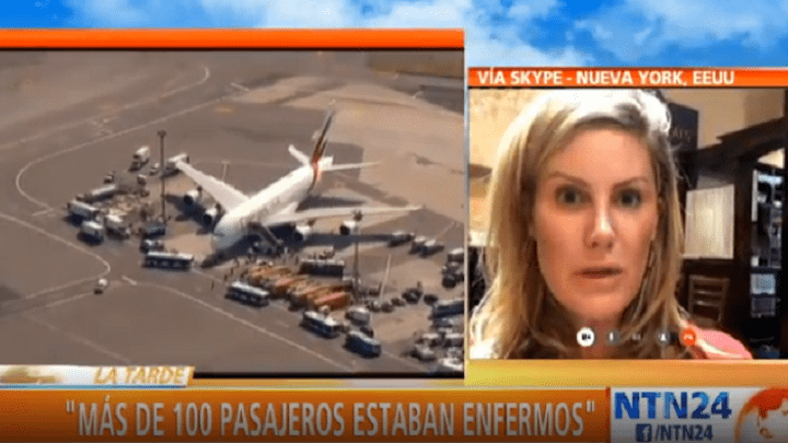 Erin Sykes, pasajera del vuelo de la aerolínea Emirates que fue puesto en cuarentena en el aeropuerto John F. Kennedy de Nueva York luego de que 10 de sus pasajeros se sintieran enfermos, habló con NTN24 sobre la situación y dijo que “nadie de la aerolínea sabía ni dijo nada hasta 30 minutos antes de que aterrizáramos, en ese momento el piloto dijo que habían algunas personas enfermas y que íbamos a tener que permanecer en tierra por un momento, antes de salir del avión”.