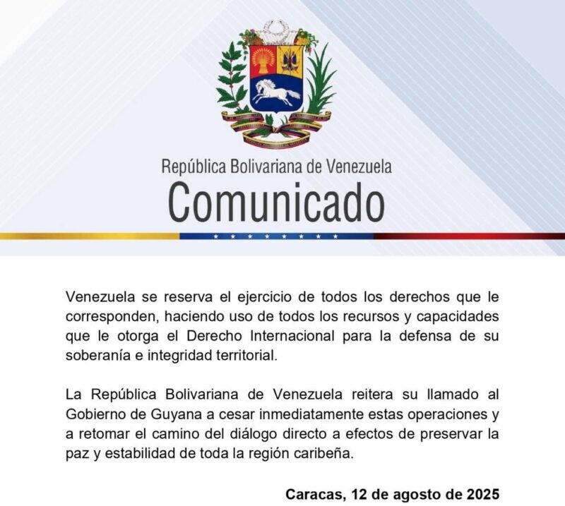 "Venezuela reitera que dichas operaciones se realizan en un área marítima pendiente de delimitación entre ambos Estados, lo que las convierte en ilegales según el derecho internacional", señaló el escrito.