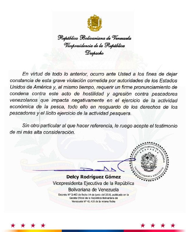 "Denunciamos y dejamos constancia de la grave violación a la soberanía nacional por parte del Gobierno de los EE.UU.", señaló Rodríguez a través de su cuenta en Telegram, donde además compartió la comunicación.