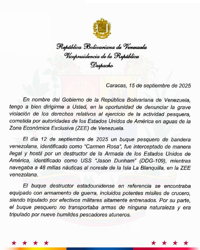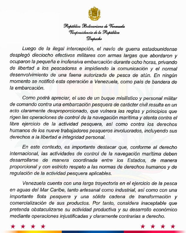 "El buque destructor estadounidense en referencia se encontraba equipado con armamento de guerra, incluidos potentes misiles de crucero, siendo tripulado por efectivos militares altamente entrenados", señaló la vicepresidenta, quien insistió en que los pescadores venezolanos no trasportaban armas de ninguna naturaleza.
