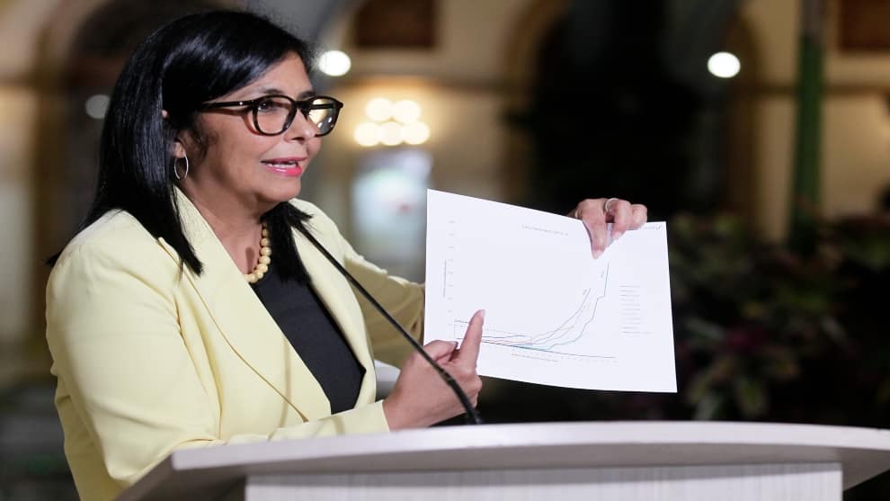 Delcy Rodríguez, vicepresidenta del régimen de Nicolás Maduro, recibió formalmente la nueva carga de asistencia técnica humanitaria que llegó a Venezuela este sábado procedente de la República Popular de China para apoyar en el tratamiento y combate del coronavirus en el país.