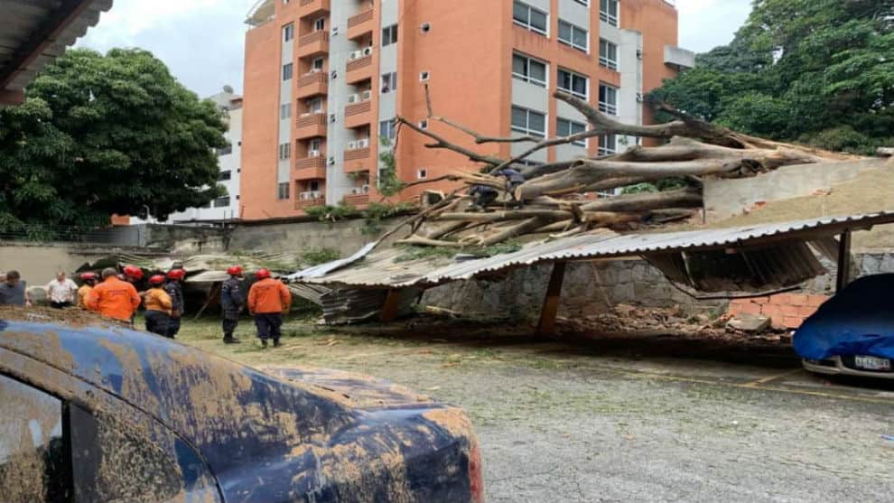 Este jueves varios árboles cayeron en la urbanización Sebucán en Caracas, afectando techos y vehículos de los edificios del sector, en el tercer día de aguaceros por el paso de una onda tropical en el mar Caribe.