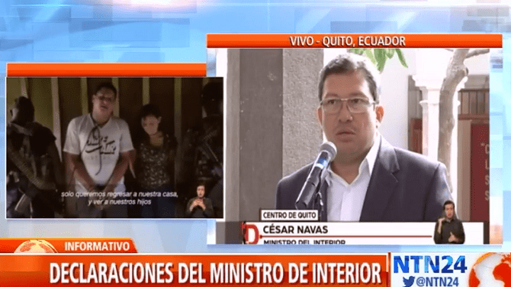 El ministro del Interior de Ecuador, César Navas, dijo que el último contacto telefónico que se tiene de las dos personas secuestradas por disidencias de FARC con su familia es del miércoles en la noche.