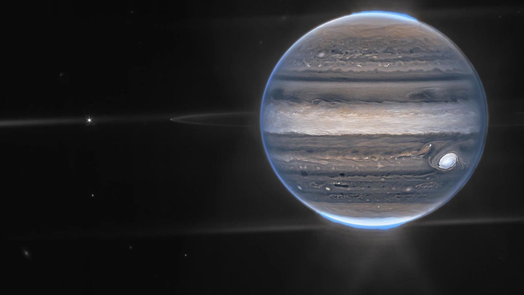 Estas vistas muestran además los anillos delgados del planeta y sus pequeñas lunas Amaltea y Adrastea, con algunas galaxias que se entremezclan en el fondo, lo cual subraya la capacidad de Webb de capturar detalles minuciosos en una sola toma.