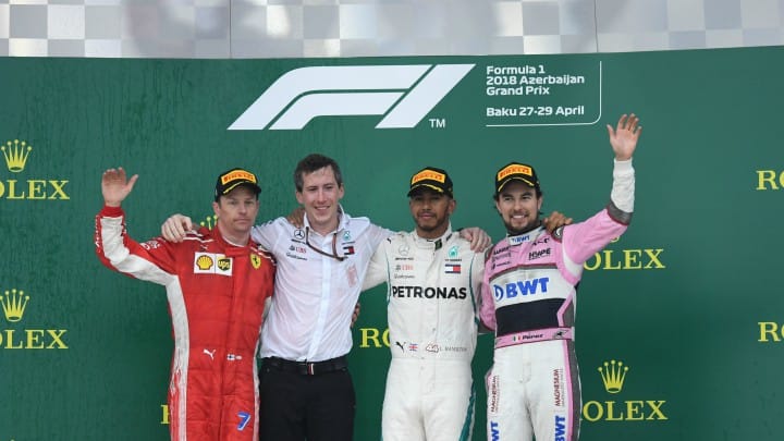Por su parte, los pilotos Kimi Raikkonen de Ferrari y Sergio Pérez de Force India, completaron el podio junto al británico en el circuito urbano de Bakú.