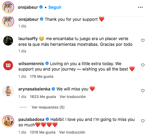 La número uno del planeta se pronunció en uno de los comentarios a la publicación en la que la tunecina anunció su despedida de las canchas que luce definitiva por el tono usado en sus palabras.