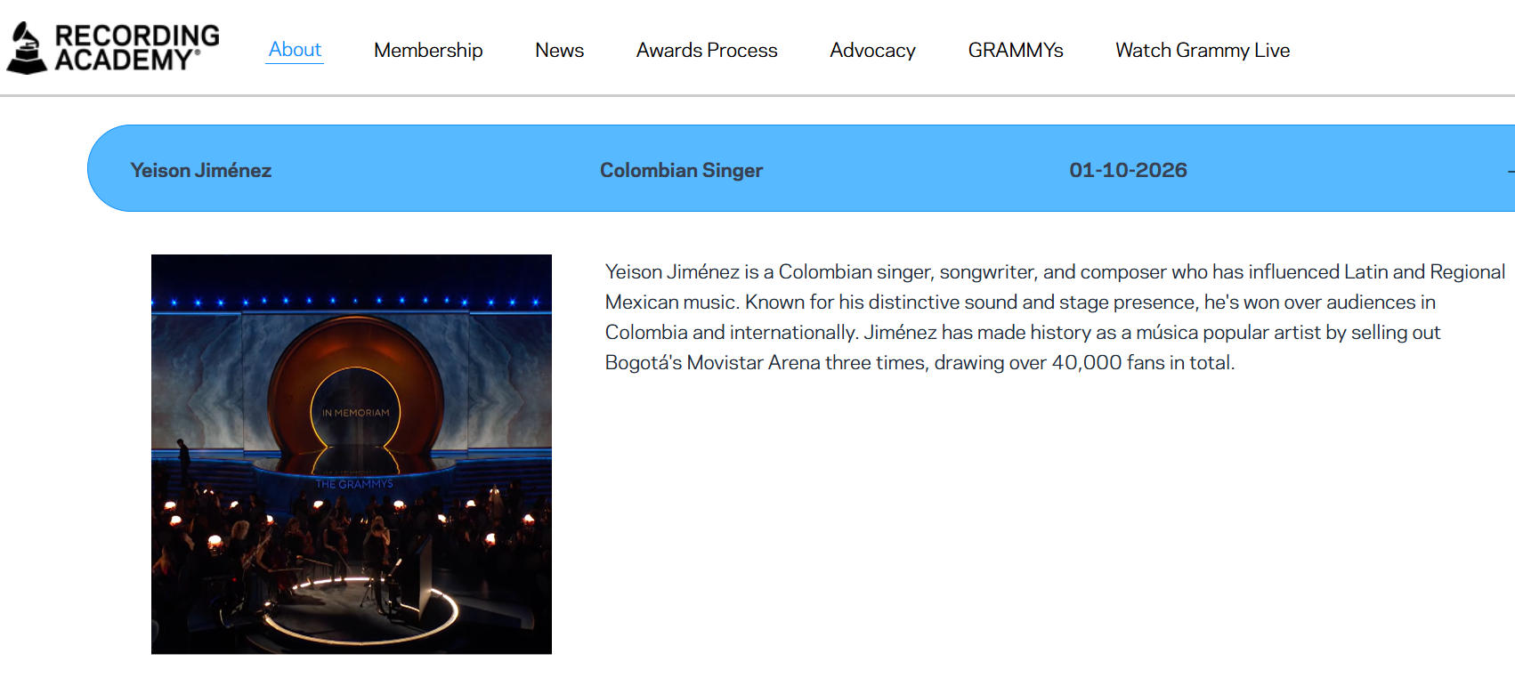 “Yeison Jiménez es un cantante, compositor y cantautor colombiano que ha influido en la música latina y regional mexicana. Conocido por su sonido distintivo y su presencia escénica, ha conquistado al público colombiano e internacional”, se lee en el sitio web de la Academia.