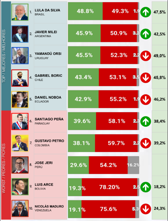 Nuevo ranking de mandatarios de Latinoamérica: Petro, Arce y Maduro entre los peores; Lula y Milei punteando